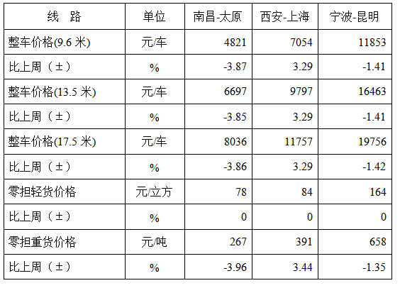 表1 本周部分線路平均價(jià)格及環(huán)比情況對(duì)比
