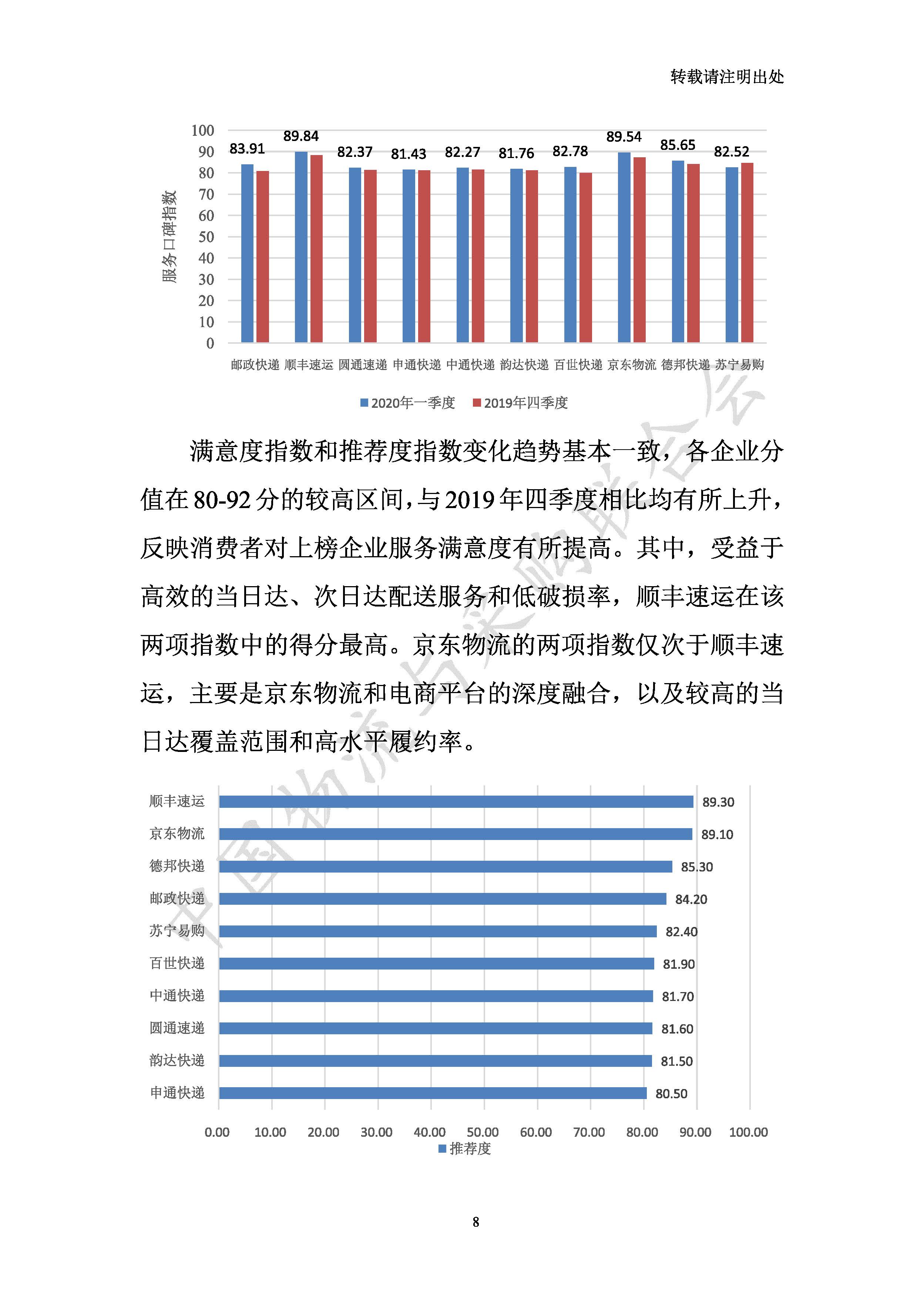 本次評價基于企業數據,大數據技術和問卷調查,在遴選的諸多代表性企業中,評選出2020年一季度中國物流服務品牌(快遞物流)十強:順豐速運、蘇寧易購、郵政快遞、百世快遞、申通快遞、德邦快遞、京東物流、中通快遞、圓通速遞、韻達快遞(排名不分先后)。十強企業平均分為75.04分,比2019年四季度上升4.2分,各企業品牌指數總體呈現上升趨勢。