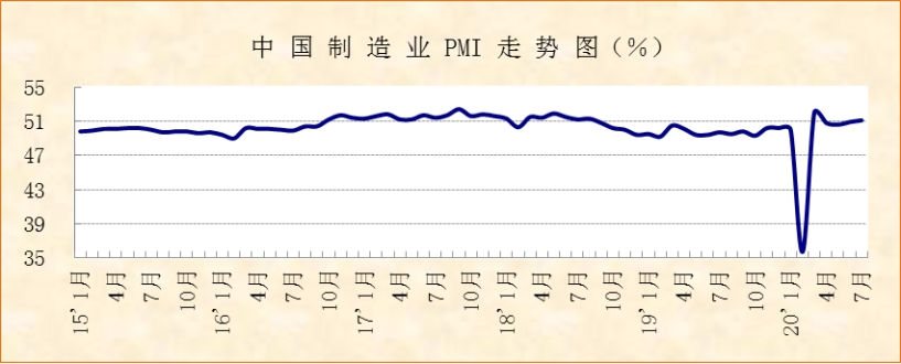 中國物流與采購聯(lián)合會、國家統(tǒng)計局服務(wù)業(yè)調(diào)查中心發(fā)布的2020年7月份中國制造業(yè)采購經(jīng)理指數(shù)(PMI)為51.1%,較上月上升0.2個百分點,經(jīng)濟回升向好發(fā)展。從分項指數(shù)來看,經(jīng)濟恢復(fù)態(tài)勢有所增強,進出口繼續(xù)保持恢復(fù)勢頭,消費品和新動能行業(yè)較快增長。當(dāng)前需重點關(guān)注市場需求不足問題。