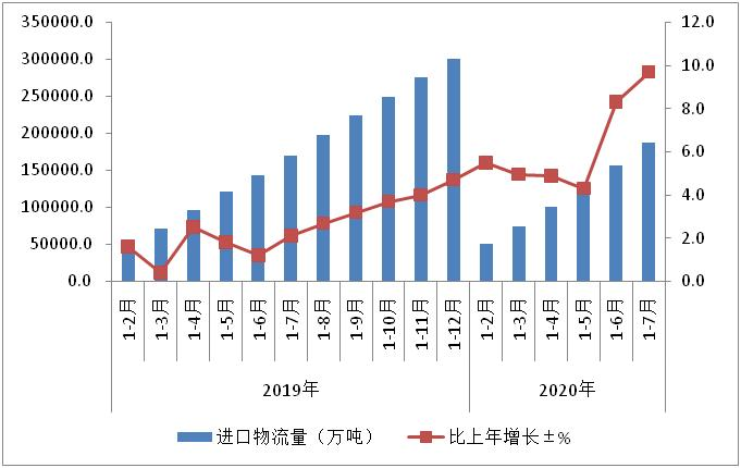 1-7月份,我國進口物流總額增長9.7%,增速比上半年提高1.4個百分點,連續(xù)三個月回升。主要貨類中,大宗商品、農(nóng)產(chǎn)品和部分機電產(chǎn)品進口量實現(xiàn)兩位數(shù)增長。其中,進口鐵礦砂同比增長11.8%;鋼材同比增長49%;原油同比增長12.1%;糧食和肉類同比分別增長23%和74%;集成電路增長24.8%。