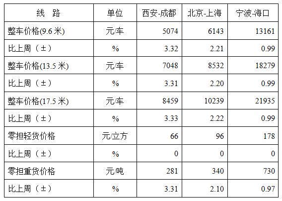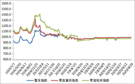 分車型看,各車型指數(shù)環(huán)比均有不同程度回暖。其中,整車指數(shù)為988.94點(diǎn),與上周基本持平;零擔(dān)輕貨指數(shù)為968.43點(diǎn),比上周回升0.02%;零擔(dān)重貨指數(shù)為989.30點(diǎn),比上周回升0.01%。