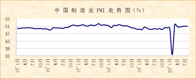 中國物流與采購聯合會、國家統計局服務業調查中心發布的2020年8月份中國制造業采購經理指數(PMI)為51%,較上月小幅回落0.1個百分點,連續6個月運行在50%以上,經濟保持平穩復蘇態勢。從分項指數來看,市場需求加快回升,供需協同性增強,新動能加快復蘇,大中型企業較快增長,經濟高質量發展具備基礎。當前需要重點關注原材料價格高位上升和小企業經營壓力加大問題。