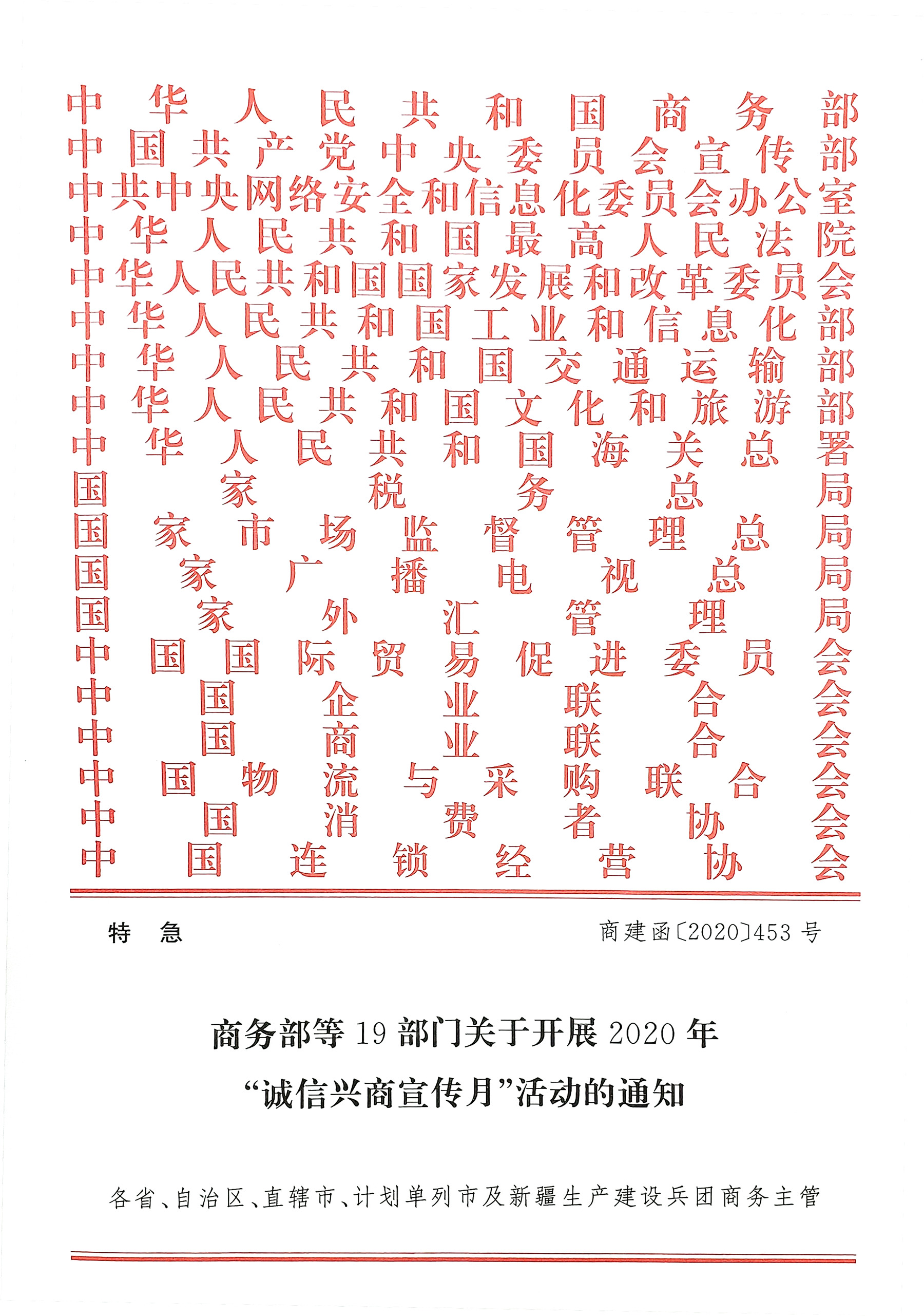 商務部等19部門關于開展2020年“誠信興商宣傳月”活動的通知