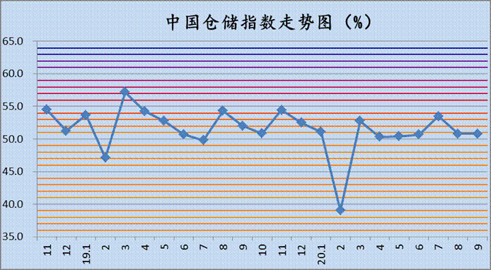 中國物流與采購聯(lián)合會(huì)與中儲(chǔ)發(fā)展股份有限公司聯(lián)合調(diào)查的2020年9月份中國倉儲(chǔ)指數(shù)為50.8%,與上月持平。設(shè)施利用率、收費(fèi)價(jià)格、主營業(yè)務(wù)成本、平均庫存周轉(zhuǎn)次數(shù)、業(yè)務(wù)活動(dòng)預(yù)期等主要分項(xiàng)指數(shù)較上月均有所回升。
