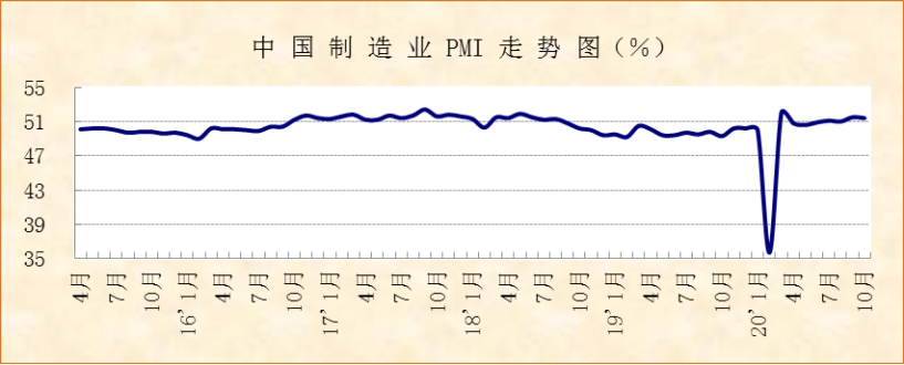 中國(guó)物流與采購(gòu)聯(lián)合會(huì)、國(guó)家統(tǒng)計(jì)局服務(wù)業(yè)調(diào)查中心發(fā)布的2020年10月份中國(guó)制造業(yè)采購(gòu)經(jīng)理指數(shù)(PMI)為51.4%,較上月小幅下降0.1個(gè)百分點(diǎn),連續(xù)4個(gè)月運(yùn)行在51%及以上,經(jīng)濟(jì)繼續(xù)保持穩(wěn)定復(fù)蘇態(tài)勢(shì)。分項(xiàng)指數(shù)變化顯示,市場(chǎng)需求增長(zhǎng)態(tài)勢(shì)較為穩(wěn)定,企業(yè)生產(chǎn)活動(dòng)保持平穩(wěn),進(jìn)出口繼續(xù)改善,高端制造業(yè)持續(xù)快速增長(zhǎng)。當(dāng)前值得關(guān)注的問(wèn)題是原材料購(gòu)進(jìn)價(jià)格過(guò)快上漲以及消費(fèi)品需求增速短期放緩。