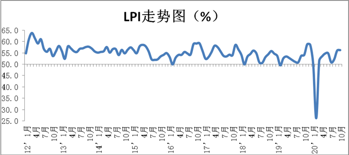 中國物流與采購聯合會發布的2020年10月份中國物流業景氣指數為56.3%,較上月回升0.2個百分點;中國倉儲指數為52.8%,較上月回升2個百分點。