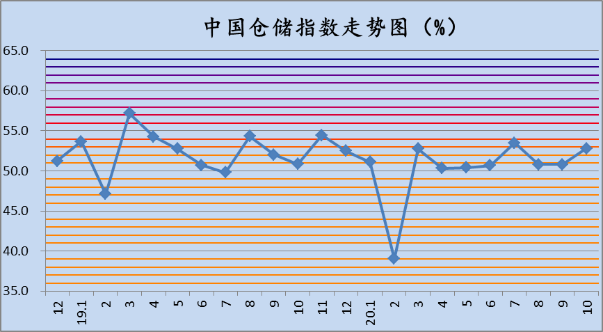 中國物流與采購聯(lián)合會與中儲發(fā)展股份有限公司聯(lián)合調(diào)查的中國倉儲指數(shù),2020年10月份為52.8%,較上月上升2.0個(gè)百分點(diǎn)。各分項(xiàng)指數(shù)中,延伸業(yè)務(wù)量指數(shù)、業(yè)務(wù)活動預(yù)期指數(shù)較上月有所回落,收費(fèi)價(jià)格指數(shù)與上月持平,其余指數(shù)均有不同程度的回升。