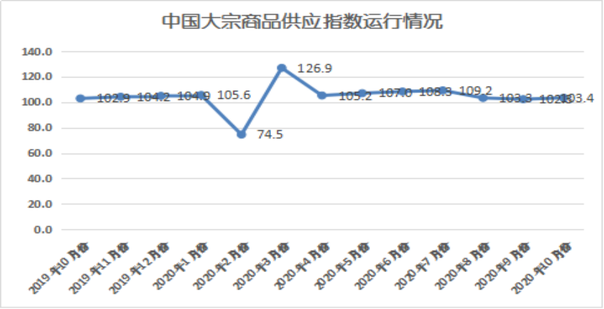 由中國(guó)物流與采購(gòu)聯(lián)合會(huì)調(diào)查、發(fā)布的2020年10月份中國(guó)大宗商品指數(shù)(CBMI)為103.3%,較上月上升1.0個(gè)百分點(diǎn)。各分項(xiàng)指數(shù)中,供應(yīng)指數(shù)止跌反彈、銷售指數(shù)繼續(xù)上升,庫(kù)存指數(shù)仍在下跌。從指數(shù)的變化情況來(lái)看,本月指數(shù)止跌反彈,且供需雙側(cè)聯(lián)動(dòng)上升,供需兩旺,特別是需求旺季持續(xù)發(fā)力,消費(fèi)端增速快于供應(yīng)端,市場(chǎng)運(yùn)行穩(wěn)中向好,整體表現(xiàn)符合預(yù)期。