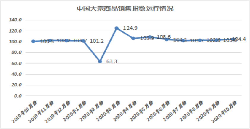 2020年10月份,大宗商品銷售指數(shù)繼續(xù)上升,當(dāng)月較上月上升1.4個(gè)百分點(diǎn),至104.4%,顯示大宗商品終端需求持續(xù)回暖,市場(chǎng)訂貨積極性高漲,企業(yè)訂單組織順暢。9月、10月是傳統(tǒng)消費(fèi)旺季,終端行業(yè)汽車、房地產(chǎn)、家電市場(chǎng)表現(xiàn)依然不錯(cuò)。從各主要商品的情況來(lái)看,本月各商品銷售量較上月均有增加,除汽車銷售增速略有減緩?fù)猓溆嗌唐蜂N售增速均呈現(xiàn)加快態(tài)勢(shì)。