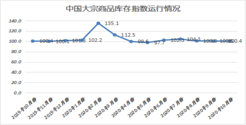 2020年10月份,大宗商品庫(kù)存指數(shù)為100.4%,較上月回落0.1個(gè)百分點(diǎn),指數(shù)連續(xù)三個(gè)月呈現(xiàn)下跌態(tài)勢(shì),并跌至近五個(gè)月以來(lái)的最低水平,顯示商品庫(kù)存增速繼續(xù)減緩,市場(chǎng)庫(kù)存壓力持續(xù)有所緩解。從各主要商品情況來(lái)看,受各自供需變化情況影響,各商品庫(kù)存量變化情況有所分化。本月鋼鐵、煤炭、成品油和有色金屬庫(kù)存減少,但鐵礦石、化工和汽車庫(kù)存量增加,且增速有所加快。