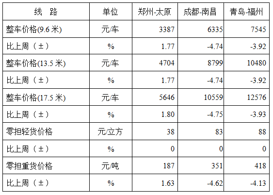 表1 本周部分線路平均價格及環(huán)比情況對比