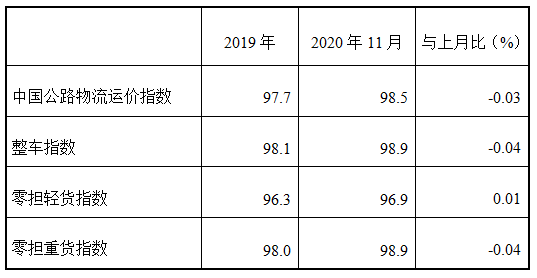 表1 2020年11月中國公路物流運價指數(shù)表