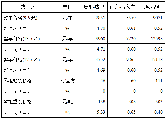 分車型看,各車型指數環比有所回升。其中,整車指數為991.63點,比上周回升0.03%;零擔輕貨指數為968.82點,比上周回升0.01%;零擔重貨指數為989.81點,比上周回升0.1%。