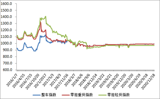 分車型看,各車型指數環比有所回升。其中,整車指數為991.91點,比上周回升0.03%;零擔輕貨指數為968.78點,與上周基本持平;零擔重貨指數為989.99點,比上周回升0.02%。