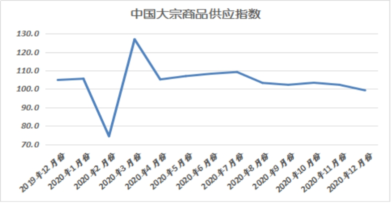 2020年12月份,大宗商品供應(yīng)指數(shù)為99.3%,指數(shù)兩連跌至近十個月以來的低點。數(shù)據(jù)顯示,12月份以來,在生產(chǎn)企業(yè)利潤收窄以及各地環(huán)保限產(chǎn)趨嚴的作用下,部分商品產(chǎn)量明顯減少,市場供應(yīng)開始下降。從各主要商品情況來看,鋼鐵、鐵礦石、煤炭和成品油供應(yīng)量繼續(xù)減少,有色金屬、化工和汽車供應(yīng)量繼續(xù)增加,且增速均有所擴大。