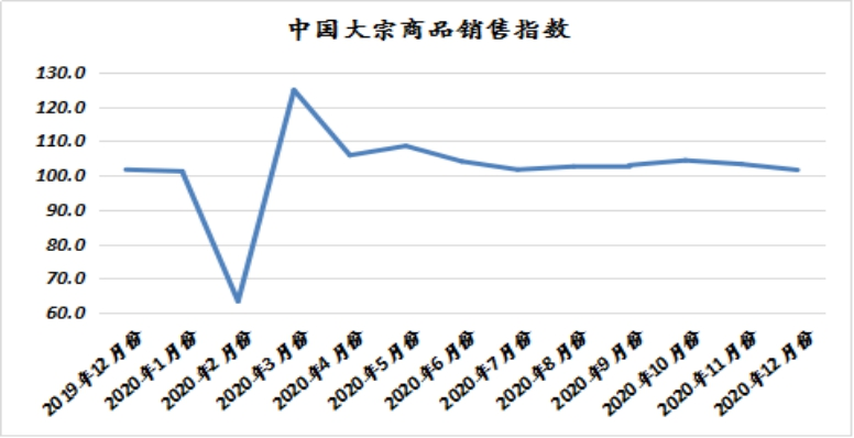 2020年12月份,大宗商品銷售指數(shù)為101.6%,較上月回落1.7個百分點,銷售增速持續(xù)減緩。從指數(shù)的變化情況來看,12月份以來,由于天氣逐漸轉(zhuǎn)冷,國內(nèi)終端需求穩(wěn)步回落,但隨著國民經(jīng)濟持續(xù)穩(wěn)定恢復(fù),促進消費政策不斷發(fā)力,制造業(yè)持續(xù)復(fù)蘇,大宗商品需求表現(xiàn)依然超出預(yù)期。各主要商品中,本月除鋼鐵和鐵礦石銷售量有所減少外,其余品種均呈現(xiàn)增加態(tài)勢,特別是有色金屬、化工和汽車銷售量增速出現(xiàn)加快的格局。