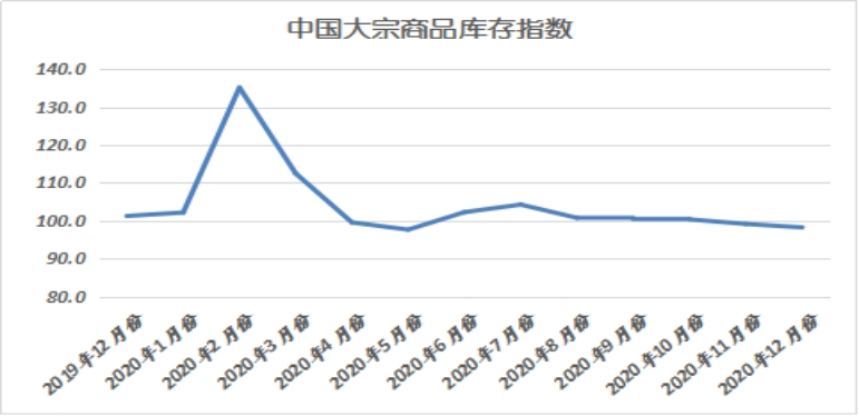 2020年12月份,大宗商品庫存指數(shù)為98.3%,較上月下降0.9個百分點,顯示隨著供應(yīng)量下降以及商品需求整體超預(yù)期,商品“去庫存化”得到延續(xù),商品庫存壓力持續(xù)緩解。各主要商品中,鋼鐵、鐵礦石、原煤和成品油庫存量繼續(xù)下降,有色金屬庫存量開始減少,化工和汽車庫存量則繼續(xù)增加,但增速均有所減緩。
