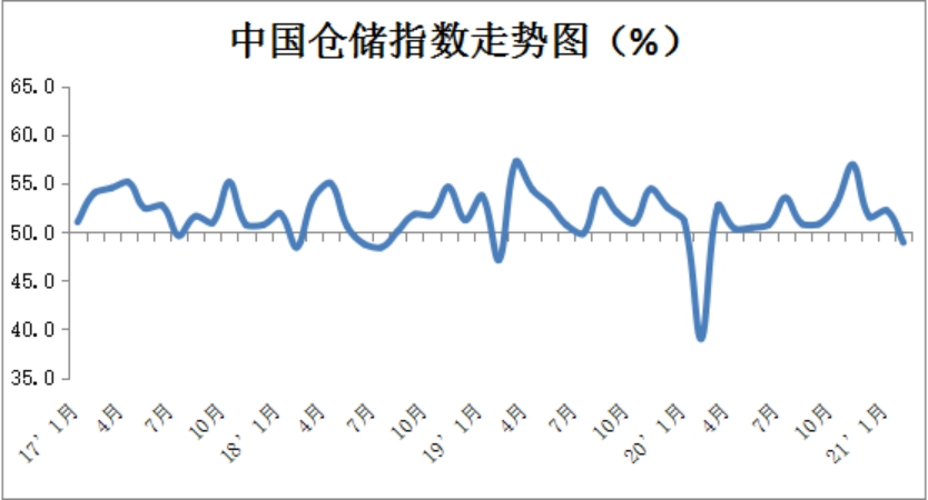 中國物流與采購聯合會發布的2021年2月份中國物流業景氣指數為49.8%,較上月回落4.6個百分點;中國倉儲指數為48.9%,較上月回落3.3個百分點。