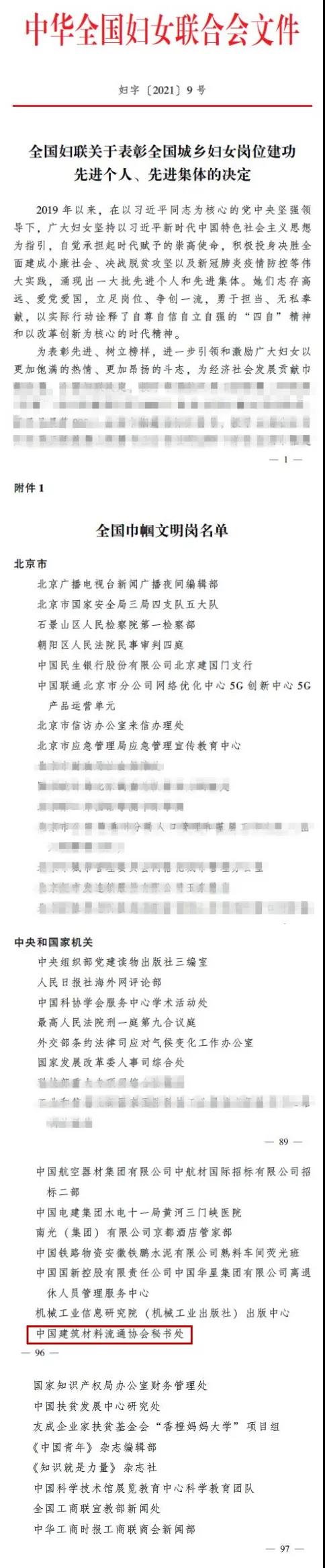 “全國巾幗文明崗”是全國婦聯為表彰積極為國家、為社會、為人民做出突出貢獻,取得優異成績的優秀婦女團體而頒發的榮譽稱號,由全國婦聯、中宣部等25家全國婦女“巾幗建功”活動領導小組成員單位共同評選。在本年度表彰名單中,“中央和國家機關”序列中僅有包括中國建筑材料流通協會在內的2家全國性專業行業協會。