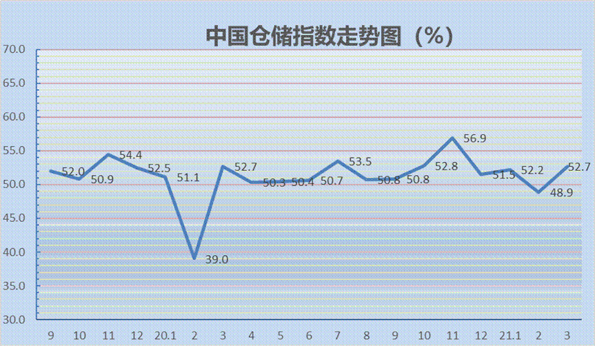 中國物流與采購聯合會與中儲發展股份有限公司聯合調查的中國倉儲指數,2021年3月份為52.7%,較上月回升3.8個百分點。各分項指數中,設施利用率指數、期末庫存指數及企業員工指數較上月有所回落,其余指數均有不同程度的回升。