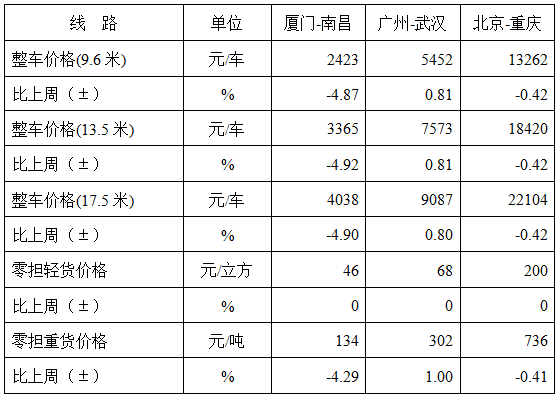 分車型看,各車型指數環比略微回落。其中,整車指數為1007.41點,比上周回落0.03%;零擔輕貨指數為981.29點,與上周基本持平;零擔重貨指數為1005.89點,比上周回落0.02%。