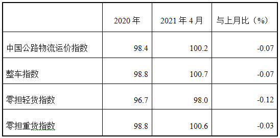 表1 2021年4月中國公路物流運價指數(shù)表