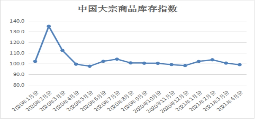2021年4月份,大宗商品庫存指數兩連跌至99.1%,顯示前期持續處于積壓態勢的商品庫存開始減少,國內大宗商品庫存壓力有所緩解。各主要商品中,除鐵礦石、化工和汽車庫存量略有增加外,其余品種均有不同程度的減少,且鐵礦石和化工庫存增速較上月還有所減緩。