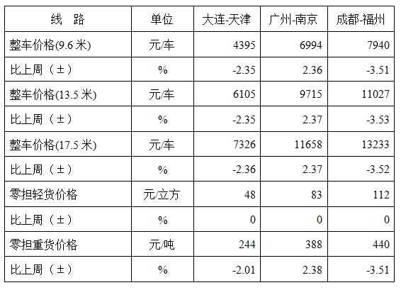 表1 本周部分線路平均價格及環(huán)比情況對比
