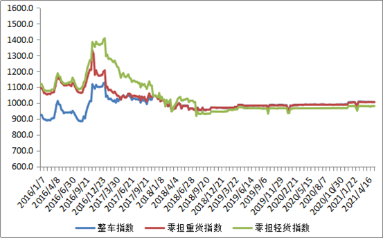 分車型看,各車型指數(shù)環(huán)比有所回升。其中,整車指數(shù)為1006.95點,比上周回升0.05%;零擔輕貨指數(shù)為981.46點,與上周基本持平;零擔重貨指數(shù)為1006.31點,比上周回升0.06%。