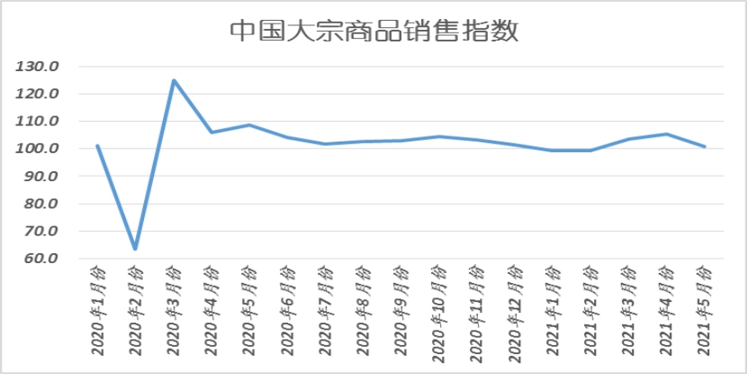 2021年5月份,大宗商品銷售指數為100.8%,較上月回落4.7個百分點,銷售增速明顯減緩。從市場情況來看,近期隨著南方陸續進入梅雨季節,終端需求開始逐漸放緩,1-4月份房地產市場增速較1-3月份略有減速,后市繼續大增動能稍顯不足,加上近期宏觀政策依然對房地產市場持收緊態勢,短期對大宗商品市場的支撐或有減弱;“缺芯”問題對企業生產影響將持續較長時間,汽車行業的需求也將有所收緊。不過,本月銷售指數大幅回落,我們認為一方面是前期需求端增長較快,基數較高;另一方面是近期商品價格波動較大,引起部分終端需求進入觀望階段,隨著價格回歸合理,前期被積壓的需求或有一定釋放。從各主要商品來看,本月鋼鐵、鐵礦石和汽車銷售量均出現下降格局,煤炭、成品油、有色金屬和化工銷售量雖較上月有所增加,但增速均有不同程度的減緩。