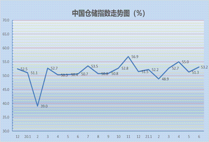 中國物流與采購聯合會與中儲發展股份有限公司聯合調查的中國倉儲指數,2021年6月份為53.2%,較上月回升1.9個百分點。各分項指數中,新訂單指數、業務活動預期指數較上月有所回落,延伸業務量指數與上月持平,其余指數均有不同程度的回升。