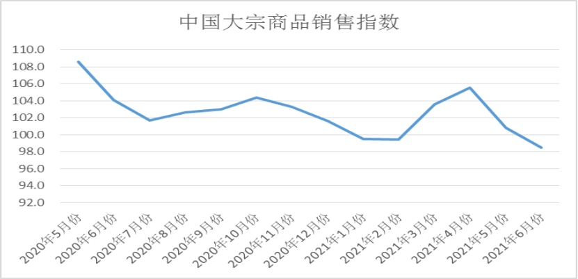 2021年6月份,大宗商品銷售指數(shù)為98.5%。銷售量在連續(xù)三個(gè)月呈現(xiàn)增長(zhǎng)態(tài)勢(shì)以后,本月出現(xiàn)回落,說明本月市場(chǎng)需求減弱,特別是隨著商品價(jià)格出現(xiàn)震蕩回調(diào),市場(chǎng)恐慌情緒加重,終端企業(yè)采購越發(fā)趨于謹(jǐn)慎,市場(chǎng)訂貨積極性明顯降低,成交明顯減弱,商品生產(chǎn)供應(yīng)企業(yè)訂單組織壓力加大。各主要商品中,煤炭和成品油銷售量繼續(xù)增加,有色金屬和化工銷售量均時(shí)隔十五個(gè)月后再現(xiàn)下降格局,鋼鐵、鐵礦石和汽車銷售量則繼續(xù)下挫。
