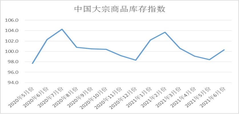 2021年6月份,大宗商品庫存指數(shù)止降回升至100.3%,較上月回升1.9個(gè)百分點(diǎn),顯示由于供應(yīng)端整體回升,但終端需求明顯轉(zhuǎn)弱,商品庫存再度積壓,庫存壓力開始加大。從各主要商品庫存情況來看,鋼鐵、有色金屬和化工庫存量止跌回升,汽車庫存繼續(xù)增長(zhǎng),鐵礦石庫存繼續(xù)下降,煤炭和成品油庫存量雖繼續(xù)減少,但降幅有所收窄。