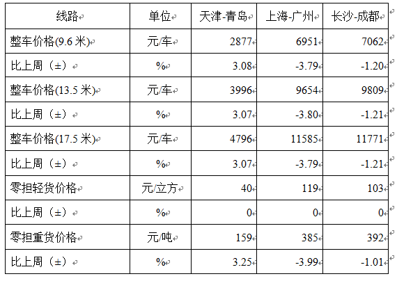 分車型看,各車型指數環比漲跌互現。其中,整車指數為1005.34點,比上周回落0.03%;零擔輕貨指數為981.24點,比上周回升0.01;零擔重貨指數為1004.69點,比上周回落0.05%。