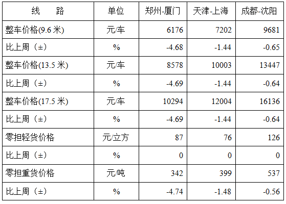 分車型看,各車型指數環比漲跌互現。其中,整車指數為1004.04點,比上周回落0.03%;零擔輕貨指數為981.10點,與上周持平;零擔重貨指數為1003.76點,比上周回落0.02%。