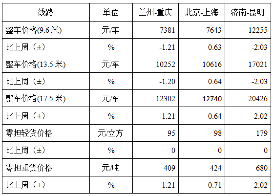 表1本周部分線路平均價格及環比情況對比