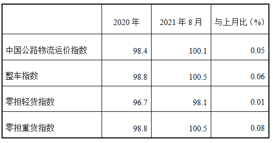 表1 2021年8月中國公路物流運價指數表