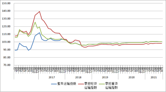 分車型指數看,各車型指數環比略有回升,相比去年同期保持小幅增長。以大宗商品及區域運輸為主的整車指數為100.5點,比上月回升0.06%,比上年同期增長1.6%。零擔指數中,零擔輕貨指數為98.1點,比上月回升0.01%,比上年同期增長1.3%;零擔重貨指數為100.5點,比上月回升0.08%,比上年同期增長1.5%。