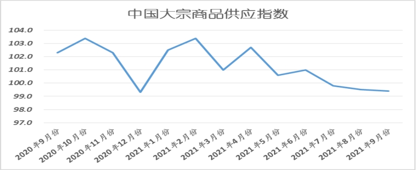 2021年9月份,大宗商品供應指數為99.4%,較上月回落0.1個百分點,指數三連降至近九個月以來的最低點,顯示供給端在政策干預下,呈現持續下降的態勢,特別是“拉閘限電”對“雙高”行業的供應影響明顯。2021年8月下旬以來,已經有20個省、自治區和直轄市出臺了力度不等的停電、限電措施。目前遼寧、黑龍江、吉林三省已經開始對居民用電進行限制,其余省份影響的是工業用電,主要集中在“雙高”產業或項目,例如鋼鐵、電解鋁、工業硅、煤化工、紡織印刷和化纖等。從各主要商品情況來看,本月鋼鐵、有色金屬和汽車供應量繼續下降,化工供應量重回下降區間,成品油供應量增速減緩,原煤供應量增速加快,鐵礦石供應量止跌回升。