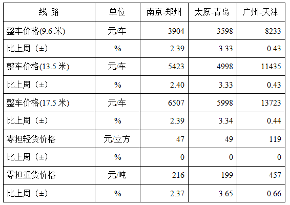 表1 本周部分線路平均價(jià)格及環(huán)比情況對(duì)比