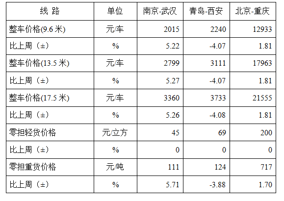 分車型看,部分各車型指數環比有所回升。其中,整車指數為1008.85點,比上周回升0.06%;零擔輕貨指數為980.86點,與上周基本持平;零擔重貨指數為1007.29點,比上周回升0.07%。