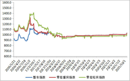 分車型看,各車型指數(shù)環(huán)比小幅回升。其中,整車指數(shù)為1032.14點(diǎn),比上周回升2.30%;零擔(dān)輕貨指數(shù)為1004.46點(diǎn),比上周回升2.41%;零擔(dān)重貨指數(shù)為1030.52點(diǎn),比上周回升2.32%。