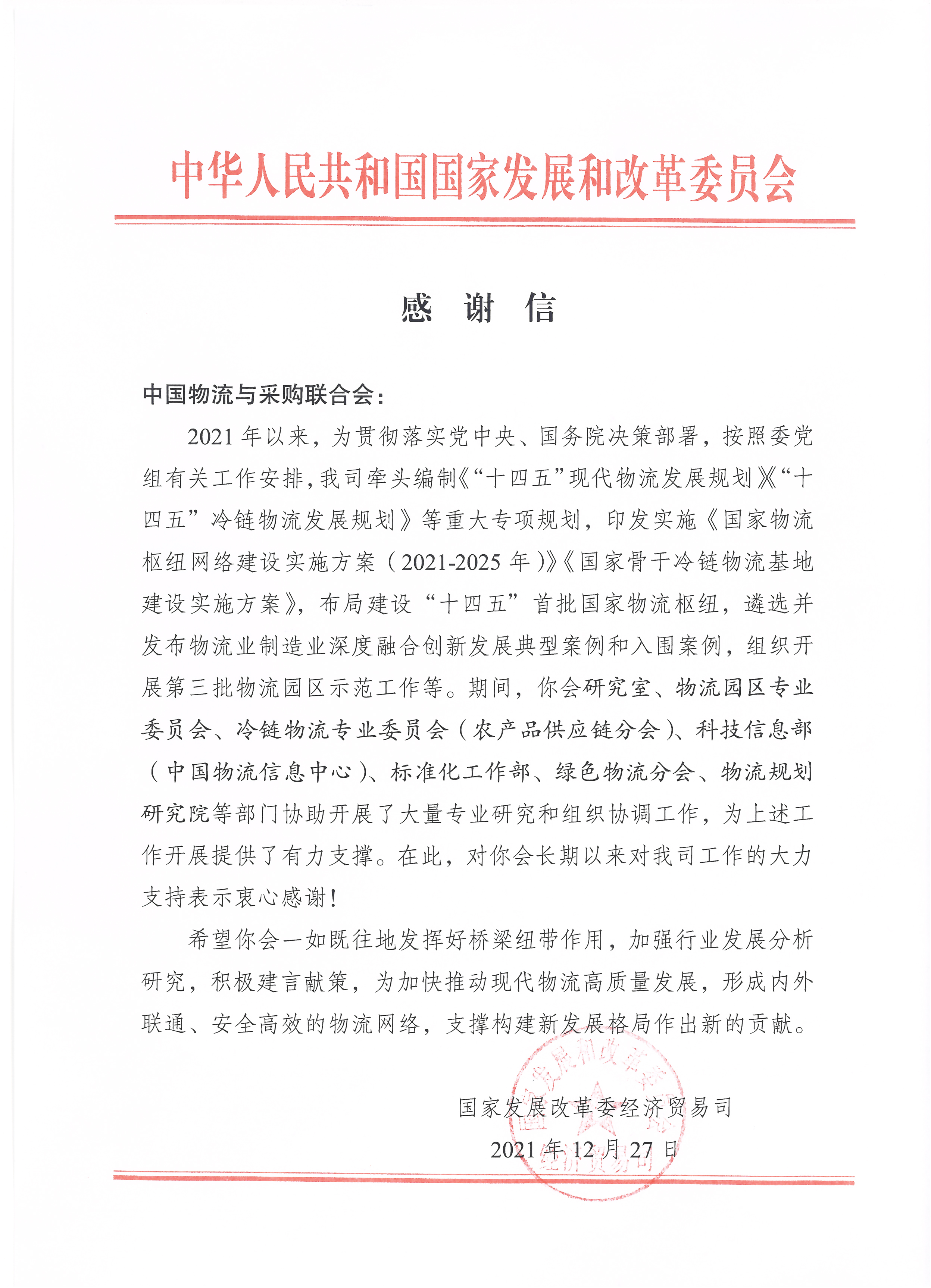 國家發展改革委致中物聯感謝信