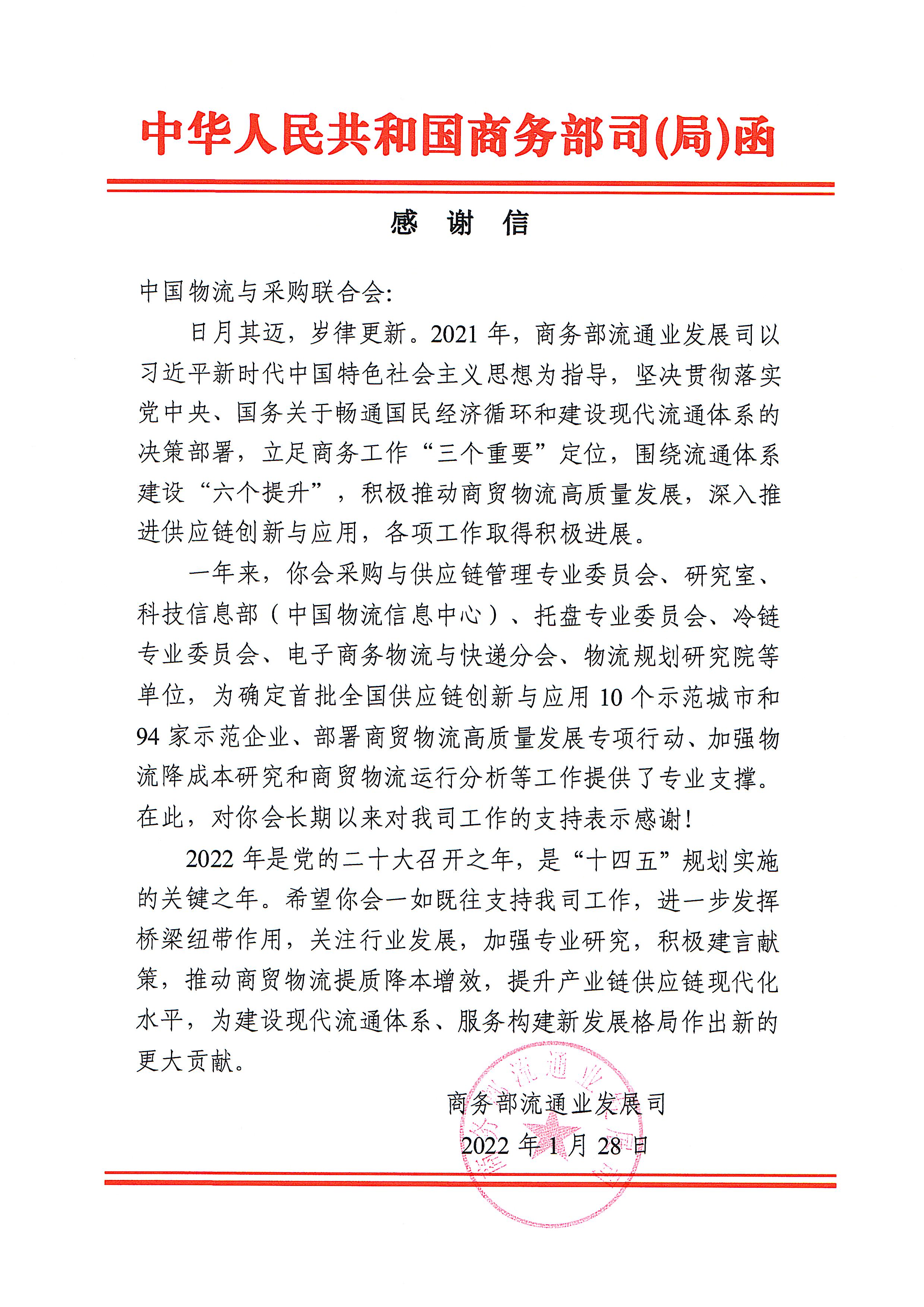 商務部流通業發展司致信感謝中物聯