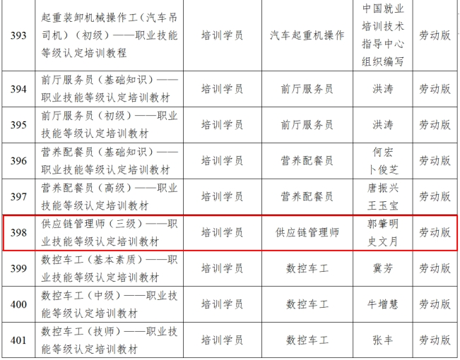 為引領(lǐng)、規(guī)范技工院校和職業(yè)培訓(xùn)機(jī)構(gòu)選用全國(guó)規(guī)劃教材,近日,人力資源社會(huì)保障部辦公廳發(fā)布了《關(guān)于公布429種國(guó)家級(jí)技工教育和職業(yè)培訓(xùn)教材目錄的通知》,由中國(guó)物流與采購(gòu)聯(lián)合會(huì)(以下簡(jiǎn)稱中物聯(lián))編寫的《供應(yīng)鏈管理師國(guó)家職業(yè)技能等級(jí)認(rèn)定培訓(xùn)教材》(三級(jí))入選國(guó)家級(jí)規(guī)劃教材目錄。該目錄包括技工教育教材356本,職業(yè)培訓(xùn)教材73本。