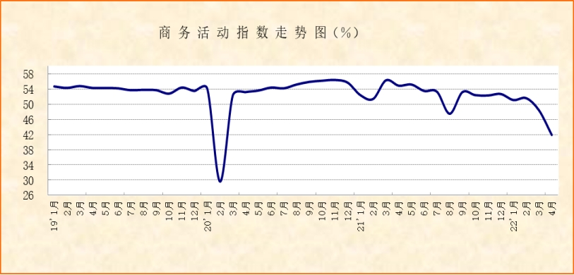 中國物流與采購聯(lián)合會、國家統(tǒng)計局服務(wù)業(yè)調(diào)查中心發(fā)布的2022年4月份中國非制造業(yè)商務(wù)活動指數(shù)較上月下降6.5個百分點至41.9%,連續(xù)2個月環(huán)比下降,降幅較上月擴大;新訂單指數(shù)較上月下降8.3個百分點至37.4%,連續(xù)6個月環(huán)比下降,降幅較上月擴大。商務(wù)活動指數(shù)和新訂單指數(shù)均創(chuàng)出自2020年3月以來的新低。綜合指數(shù)變化,在持續(xù)2個月多地疫情影響下,非制造業(yè)供需面臨著較大下行壓力。