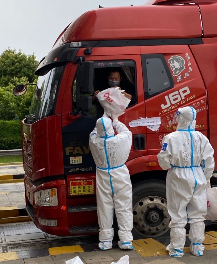 4月16日起,由滿幫集團、滿幫公益基金會聯合中共江蘇省委組織部、中共江蘇省交通運輸行業委員會、中共南京市交通運輸行業委員會、中國光大銀行南京分行、東鵬特飲共同發起的名為“同心戰役 我們在行動”的貨車司機關愛活動,向江蘇、浙江、河北、貴州等地的貨車司機送上了10000多份疫情防控“抗疫愛心包”,以緩解貨車司機在出車途中生活用品和食品短缺等問題。