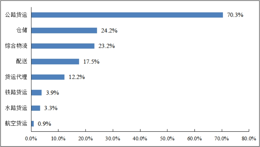 中小微物流企業主要經營業務集中在公路貨運領域。調查數據顯示,被調查企業從事公路貨運業務的占比為70.3%,其次為倉儲和綜合物流業務占比分別為24.2%、23.2%,從事鐵路、水路、航空貨運的占比相對較少,尤其是航空貨運占比僅為0.9%。這也反映公路貨運市場與其他領域相比規模巨大又較為分散。