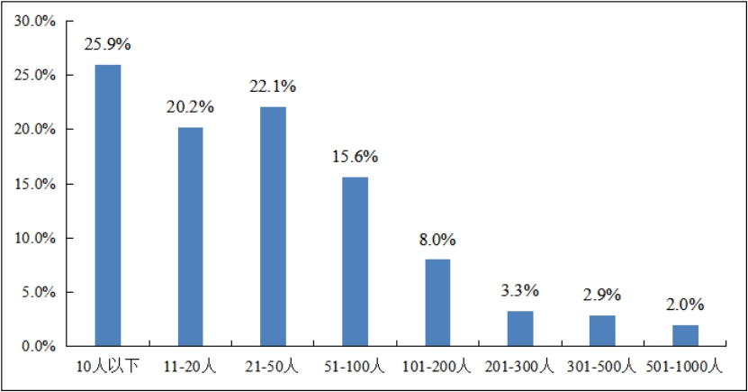 被調查企業有近七成平均員工人數在50人以內,其中四分之一的平均員工人數在10人以內,不到一成的企業員工人數在200人以上。