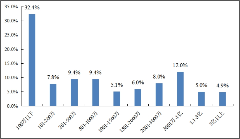 被調查企業收入規模較小,近三分之一的企業近三年平均主營業務收入規模在100萬元以下。調查數據顯示,40%的企業收入規模在200萬元以下屬于微型企業,37.9%的企業收入規模在200萬-3000萬元屬于小型企業,17%的企業收入規模在3000萬-3億元屬于中型企業。
